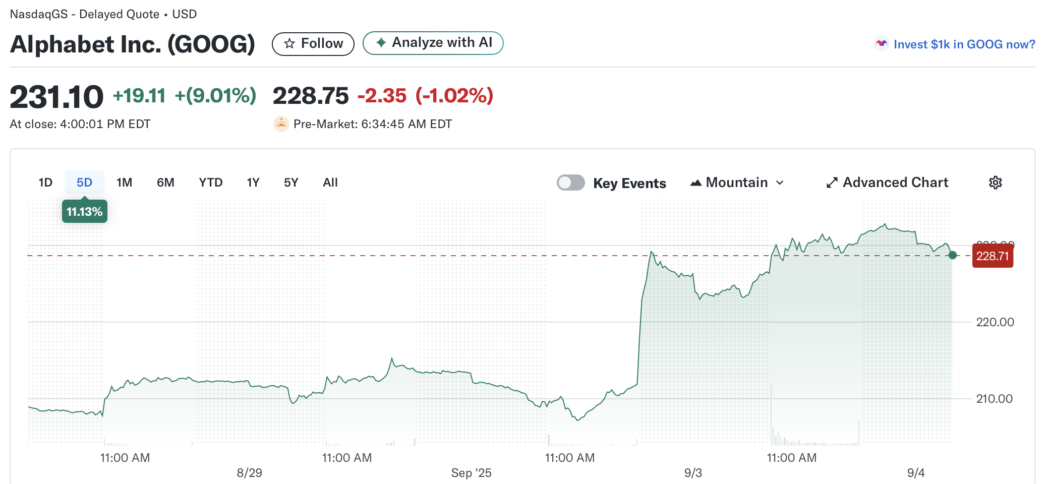 수개월간 투자자들의 마음을 졸이게 했던 미국 정부와의 반독점 소송. 회사가 쪼개질 수도 있다는 최악의 시나리오까지 거론되던 이 재판에서, Google이 사실상 승기를 잡았다는 소식이 전해졌습니다. 시장은 즉각 환호했습니다. Google의 주가는 두 자릿수에 가깝게 치솟으며 그간의 불안감을 한 방에 날려버렸죠.